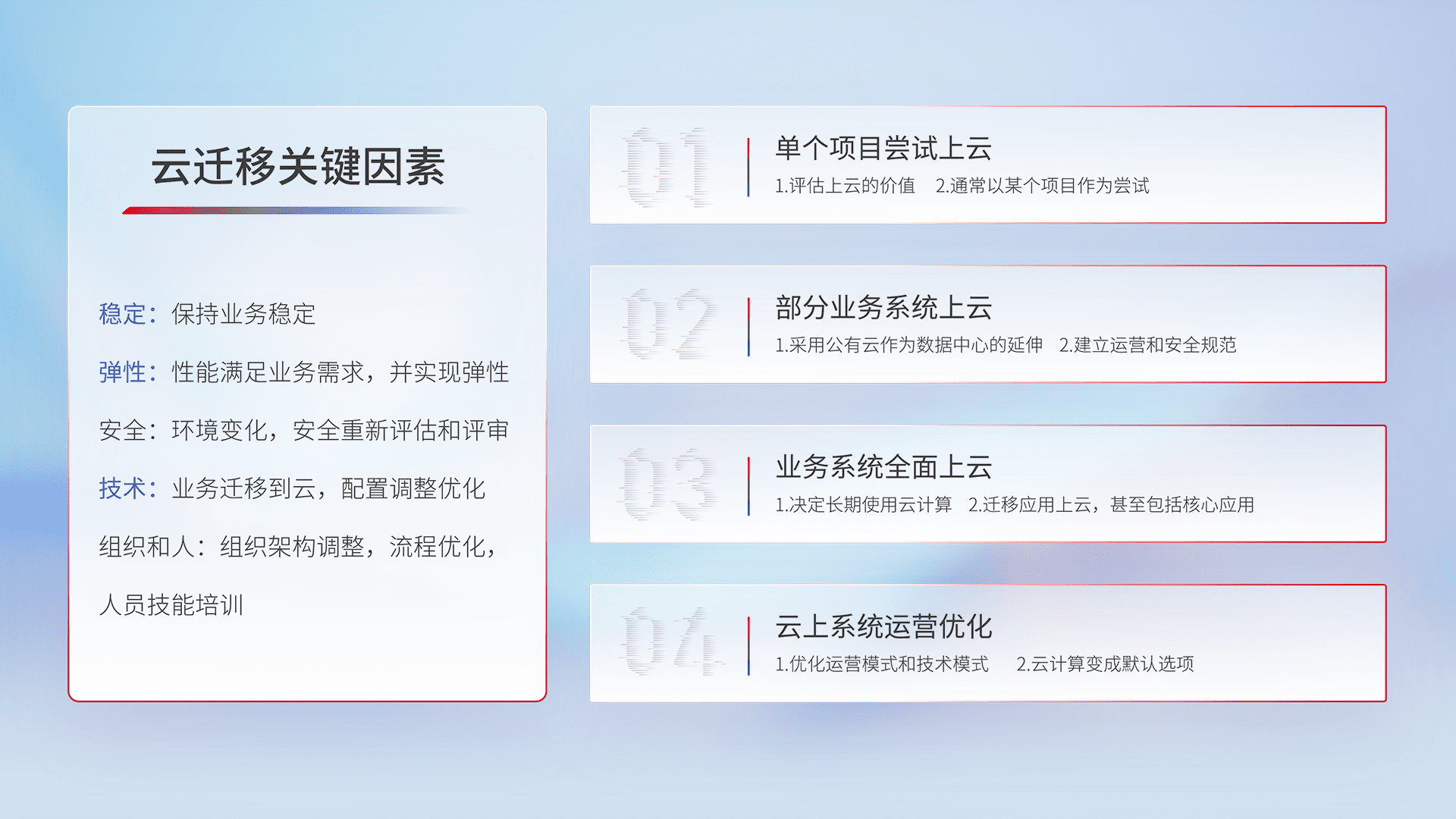 结合实际业务,,从规划设计、、、云平台选型、、、云原生改造、、数据迁移、、集成交付,,,,迁移全过程为客户识别最佳上云路径,,,做好风险识别管理,,设计网络架构、、、身份权限、、安全审计合规、、、操作审计、、、日志审计、、、监控告警策略、、多站点容灾设计等,,,对云上基础设施进行整体规划,,提升IT治理水平,,以满足弹性、、、高可用、、、、高性能的需求。。